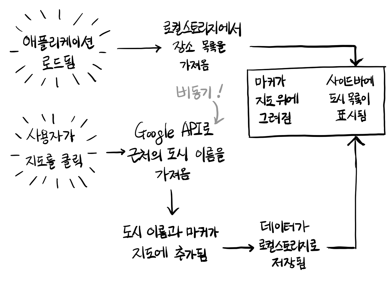 아주 간단한 애플리케이션을 생각해봅시다.아주 간단한걸로요. 예를 들어 지도에 우리가 제일 좋아하는 장소를 표시해 두는 작은 앱이 있습니다. 특별히 대단한 구석은 없어요. 그냥 오른쪽에는 지도가 있고 왼쪽에는 단순히 사이드바가 있는 형태입니다. 지도를 클릭하면 그 위에 새로운 마커가 표시됩니다.