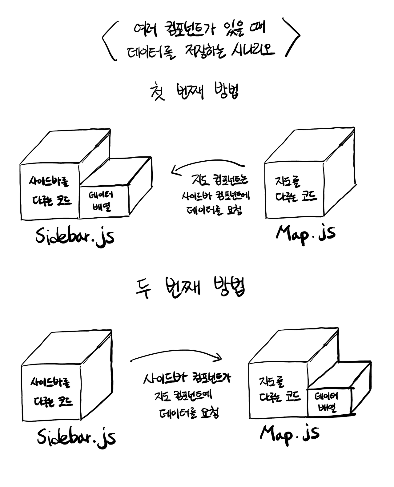 UI 이야기로 돌아가서 확실히 보이는 문제를 하나 짚어보겠습니다. 보기에는 두 개로 나뉜 인터페이스 영역이 있습니다. 사이드바와 메인 컨텐츠 영역입니다. 절대로 둘을 한꺼번에 다루는거대한 코드 덩어리 하나만 작성하면 안됩니다.이유는 명백합니다. 만약 시간이 조금 흘러 네 개의 컴포넌트를 만들어야 한다면? 아니면 여섯 개? 백 개가 된다면? 그러므로 코드를 조각조각 나누어야 합니다. 아래의 방식으로 자바스크립트 파일을 두 개로 나눌 것입니다. 하나는 사이드바를 담당하고, 다른 하나는 지도 부분을 담당합니다. 그런데 어떤 파일이 지역을 담아놓는 배열을 다루어야 할까요?