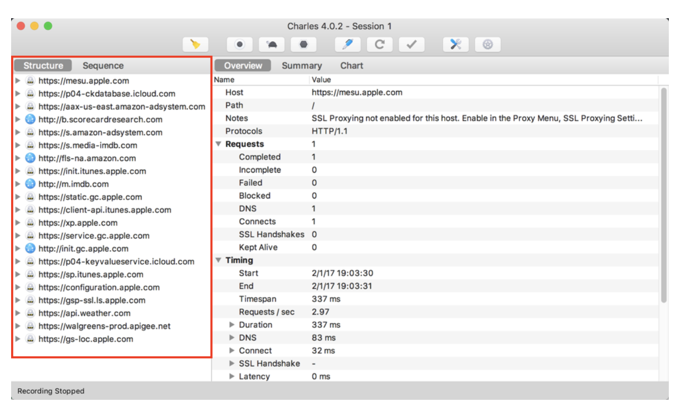 Grant Privileges를 클릭하고 비밀번호를 입력하면 Charles이 실행되자 마자 네트워크 이벤트 기록을 시작하고 왼쪽 패널에 기록된 이벤트를 확인 할 수 있습니다.