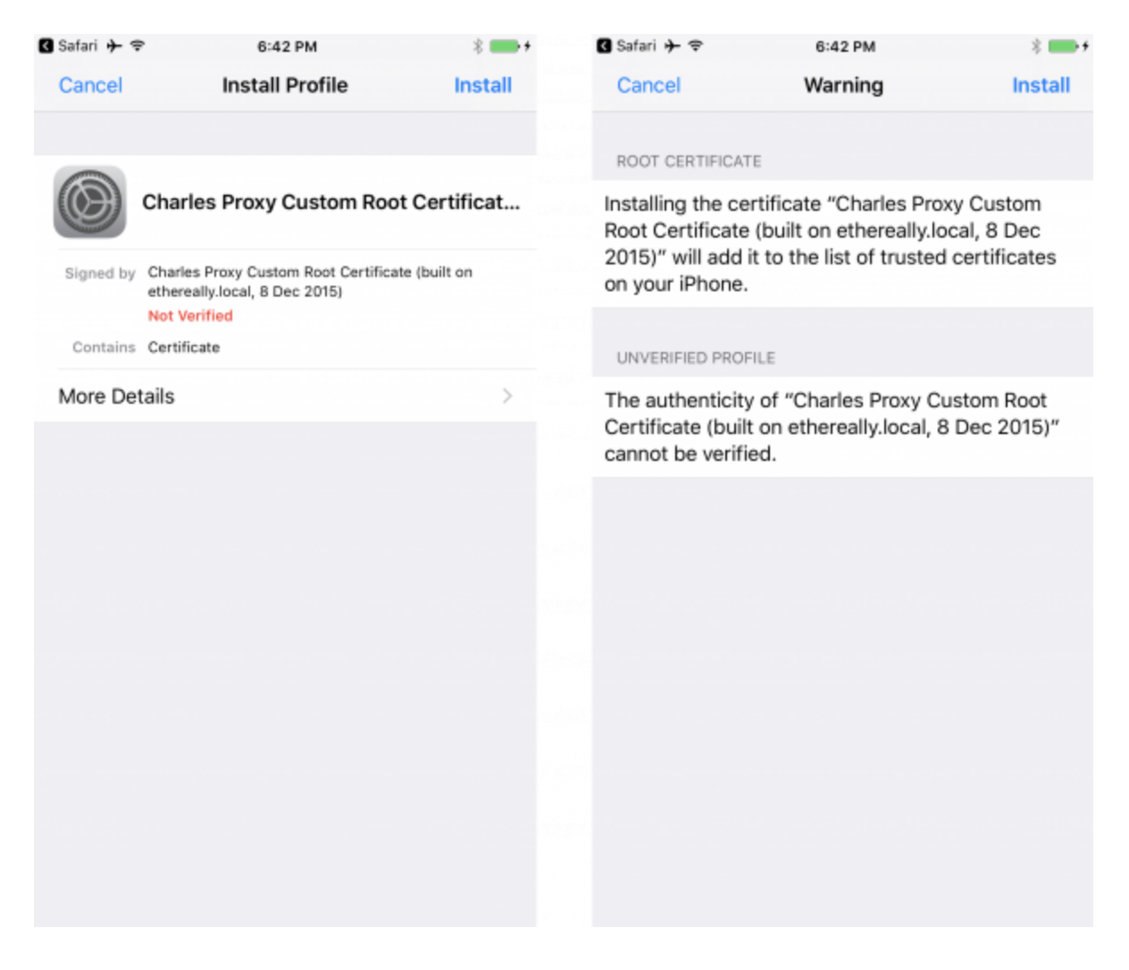 Charles는 iOS와 MacOS 기기에 신뢰 된 SSL/TLS 암호화 인증서를 생성하여 제공합니다. 신뢰할 수 있는 인증서 발행자가 인증서를 발행하지 않을 때에는 명시적으로 디바이스에 인증서를 신뢰하도록 지시할 수 있습니다. Charles에서 제공한 인증서를 디바이스에 설치하면 Charles이 해당 디바이스에서 요청하는 SSL 이벤트를 해독할 수 있습니다.