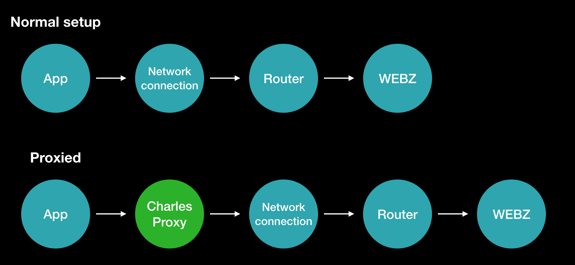 Charles는 프록시 서버이기 때문에 앱/컴퓨터와 네트워크 연결 사이에 위치함을 의미합니다. Charles를 실행할 때 자동 Network 설정에 동의했다면 모든 Network Request들이 Charles을 통하도록 네트워크 설정을 변경합니다. 이를 통해서 디바이스에서 요청하는 모든 네트워크 이벤트를 Charles이 기록 하고 검사할 수 있습니다.