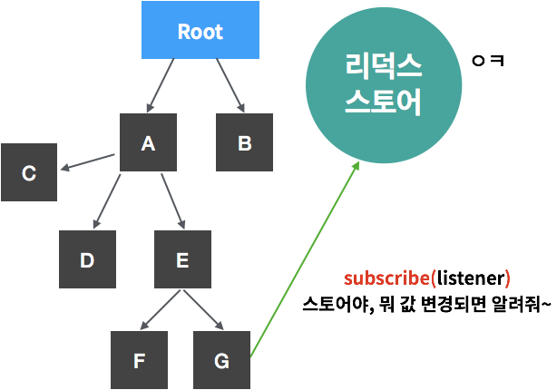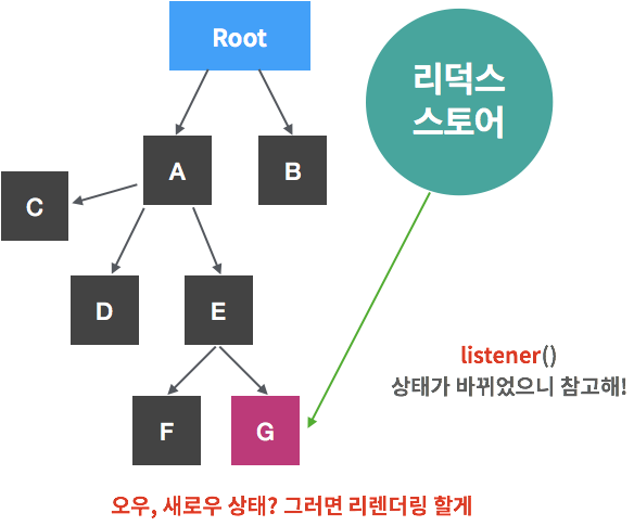 >> Store(state 갱신) >> listener(상태 변화 알림) >> 컴포넌트 리렌더링