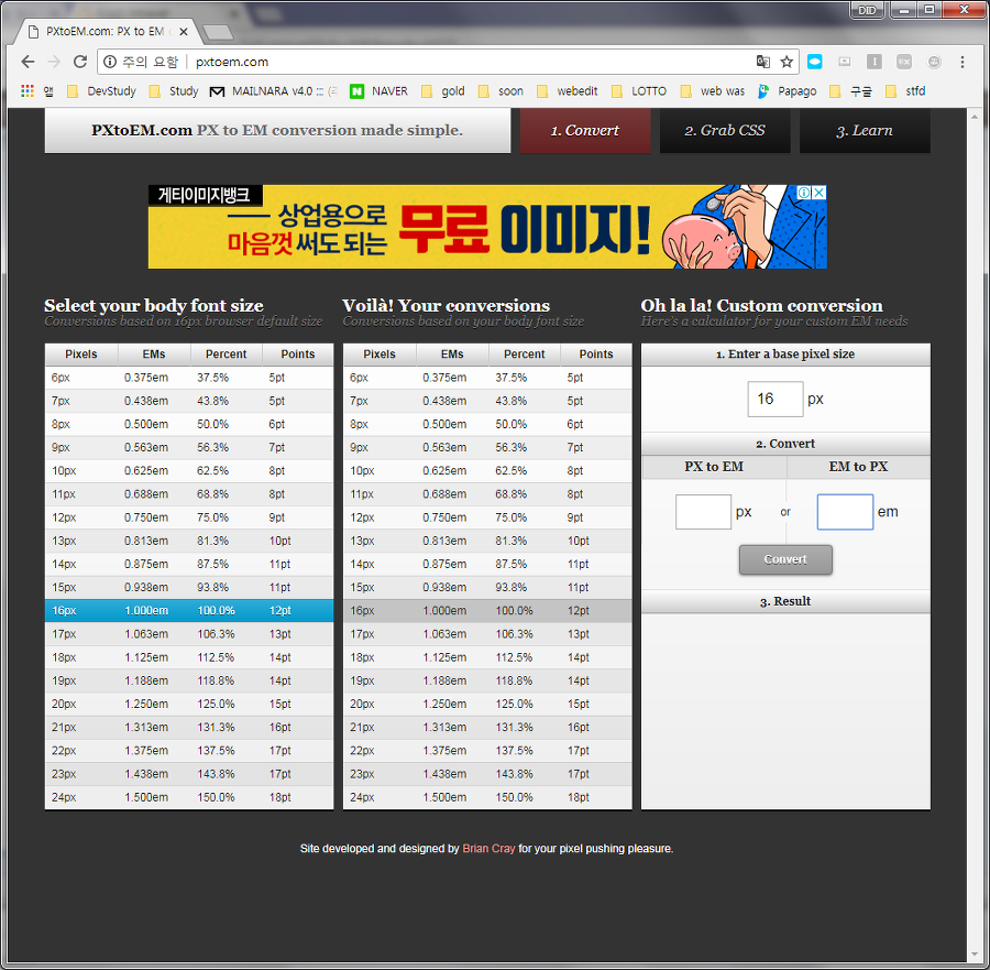 - 상단에 기준이 되는 사이즈를 설정하고 왼쪽에 px 수를 작성하면 em으로 em 수를 작성하면 px로 변환하여 주는 사이트 입니다.