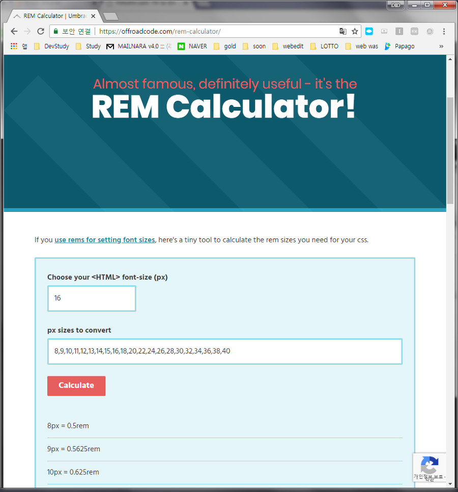 - 상단에 기준이 되는 수를 작성하고 "Calculate" 누르면 설정이 되어 있는 px을 rem으로 변환해 줍니다.