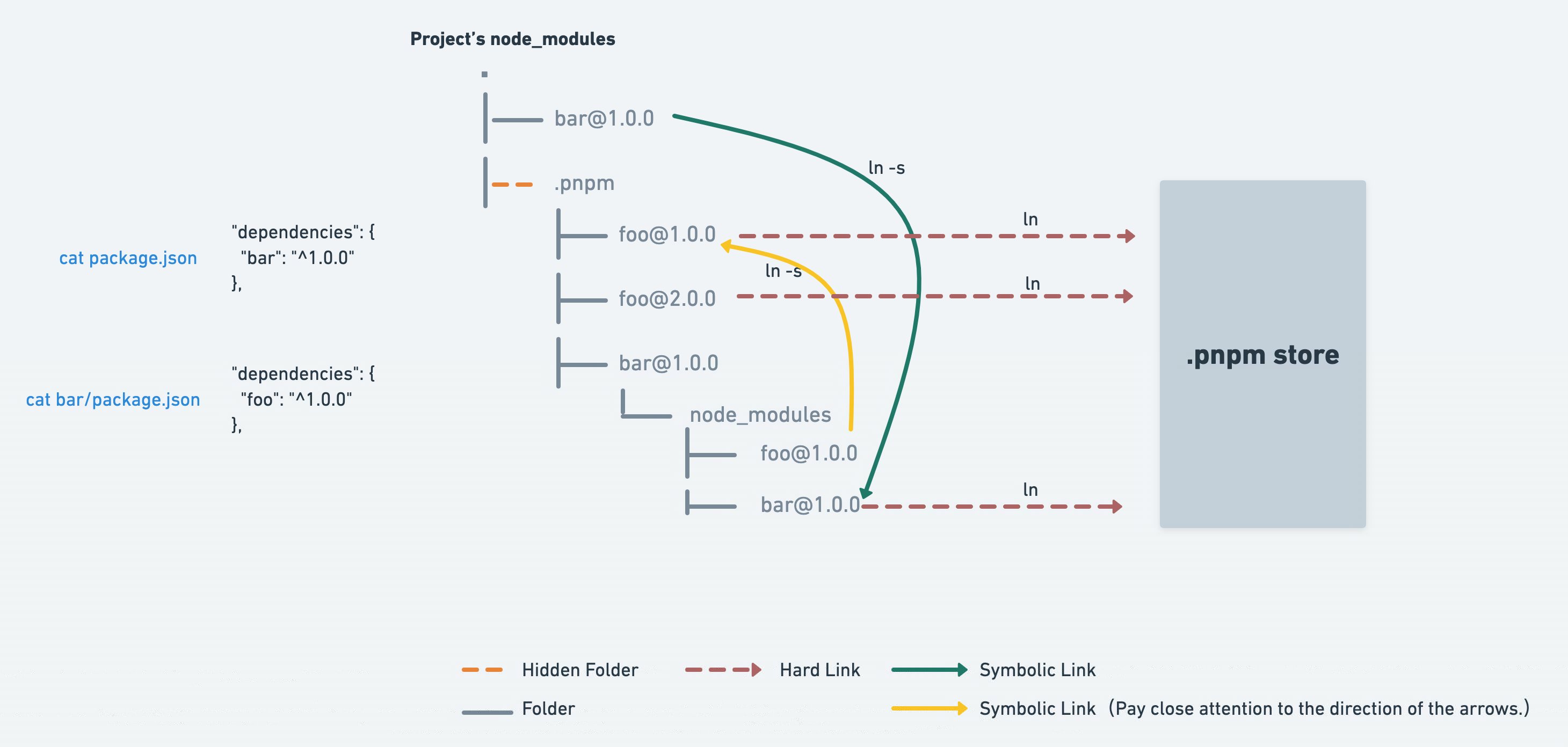 이는 node_modules의 레이아웃을 통해 이루어지고, symlinks를 사용하여 dependencies의 중첩된 구조를 생성한다. 여기서 폴더 내부의 모든 패키지 파일은 저장소에 대한 하드 링크로 구성되어 있다.