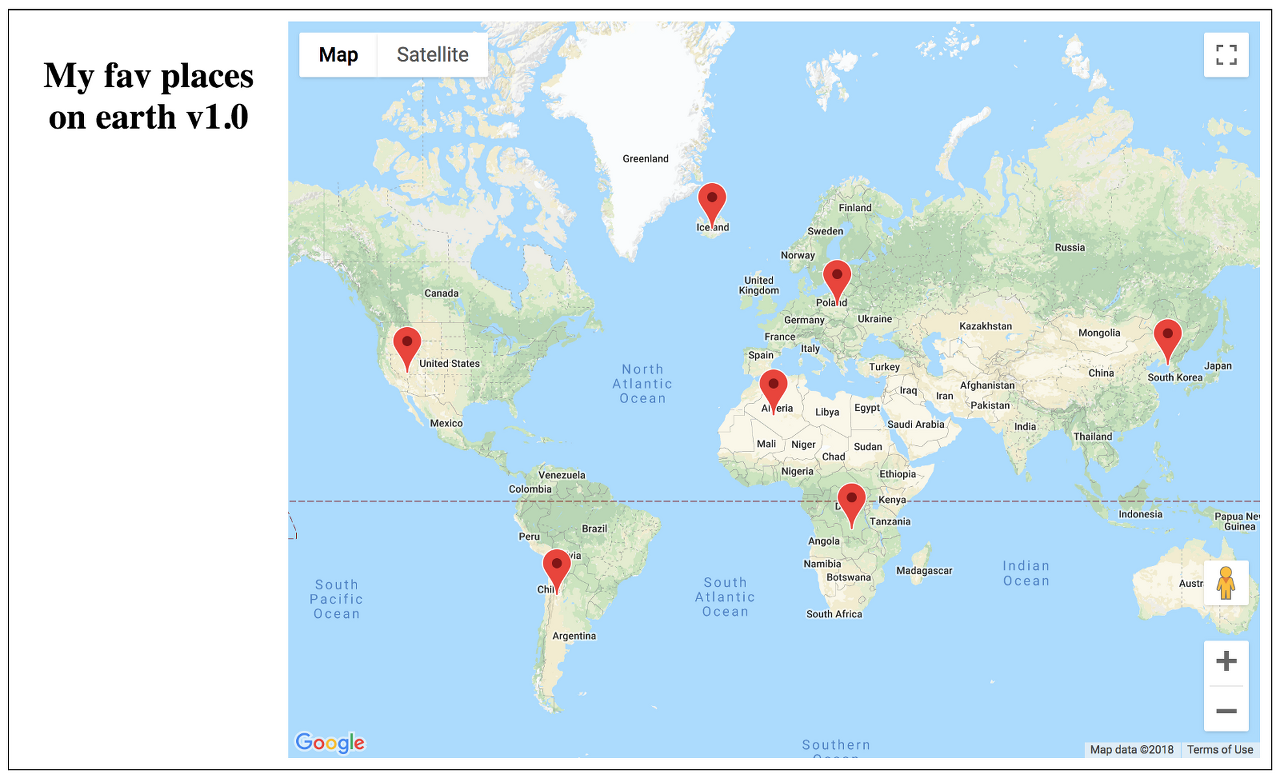 <!DOCTYPE html><html><head> <title>My Favorite Places</title> <link rel="stylesheet" href="styles.css" /></head><body> <div class="sidebar"> <h1>My fav places on earth v1.0</h1> <!-- footer를 여기에 둔다 --> </div> <div class="main-content-area"> <div id="map"></div> </div> <script src="https://maps.googleapis.com/maps/api/js?key=API_KEY_HERE"></script> <script src="map.js"></script></body></html>