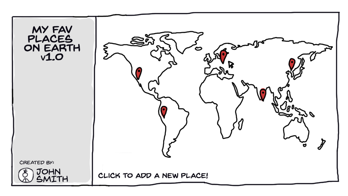 아주 간단한 애플리케이션을 생각해봅시다. 아주 간단한 걸로요. 예를 들어 지도에 우리가 제일 좋아하는 장소를 표시해 두는 작은 앱이 있습니다. 특별히 대단한 구석은 없어요. 그냥 오른쪽에는 지도가 있고 왼쪽에는 단순히 사이드바가 있는 형태입니다. 지도를 클릭하면 그 위에 새로운 마커가 표시됩니다.