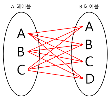 기준테이블이 A일경우 A의 데이터 한 ROW를 B테이블 전체와 JOIN하는 방식입니다.