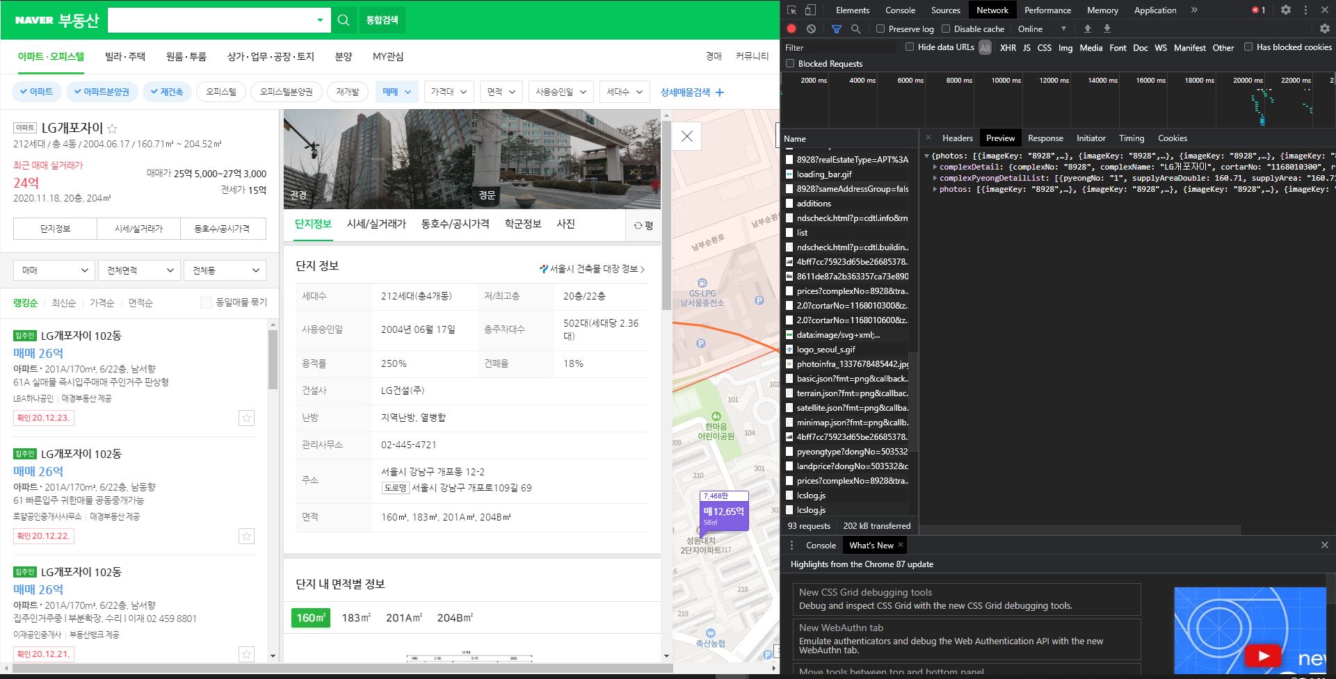 아까 개포동을 선택하여 LG개포자이를 선택하기전 F12버튼을 눌러주자(크롬기준) 그러면 알수 없는 정보들이 떠있는 요상한 화면이 뜰것이다.