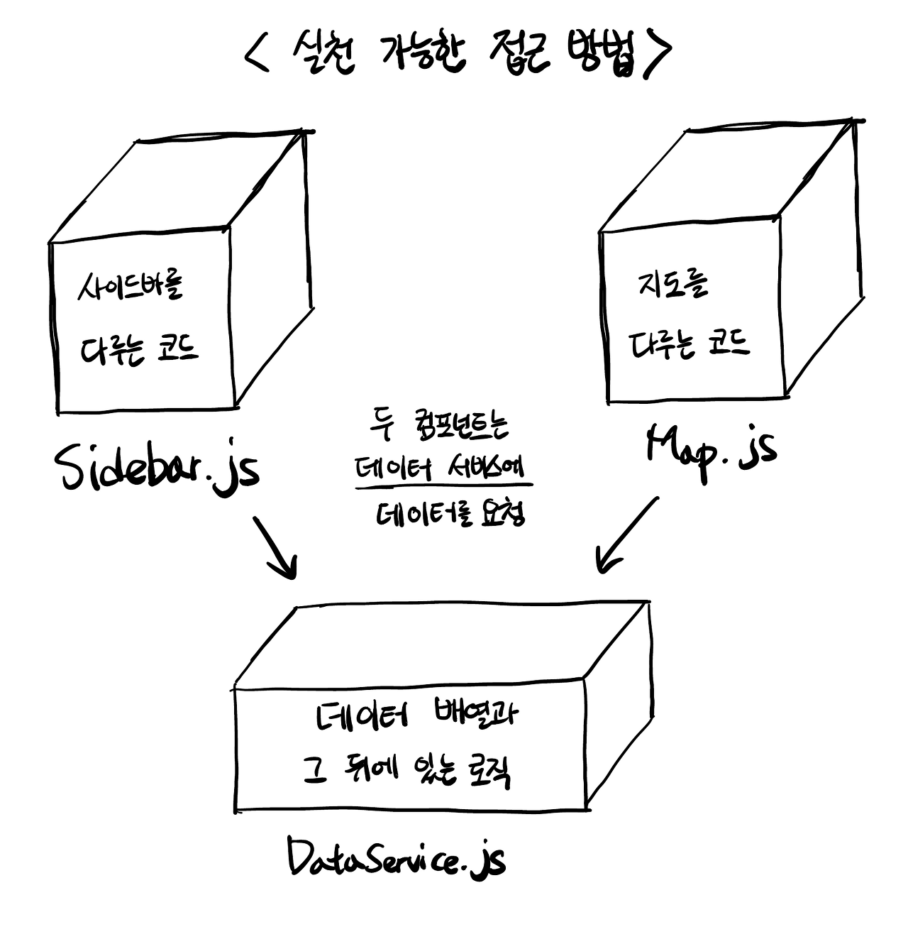 UI 이야기로 돌아가서 확실히 보이는 문제를 하나 짚어보겠습니다. 보기에는 두 개로 나뉜 인터페이스 영역이 있습니다. 사이드바와 메인 컨텐츠 영역입니다. 절대로 둘을 한꺼번에 다루는거대한 코드 덩어리 하나만 작성하면 안됩니다.이유는 명백합니다. 만약 시간이 조금 흘러 네 개의 컴포넌트를 만들어야 한다면? 아니면 여섯 개? 백 개가 된다면? 그러므로 코드를 조각조각 나누어야 합니다. 아래의 방식으로 자바스크립트 파일을 두 개로 나눌 것입니다. 하나는 사이드바를 담당하고, 다른 하나는 지도 부분을 담당합니다. 그런데 어떤 파일이 지역을 담아놓는 배열을 다루어야 할까요?