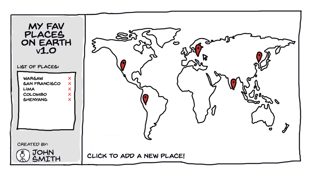 아주 간단한 애플리케이션을 생각해봅시다.아주 간단한걸로요. 예를 들어 지도에 우리가 제일 좋아하는 장소를 표시해 두는 작은 앱이 있습니다. 특별히 대단한 구석은 없어요. 그냥 오른쪽에는 지도가 있고 왼쪽에는 단순히 사이드바가 있는 형태입니다. 지도를 클릭하면 그 위에 새로운 마커가 표시됩니다.