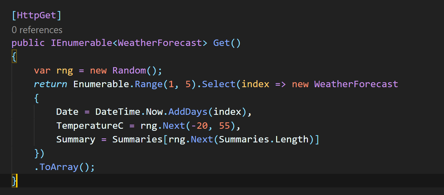 .net core web api는 Controller들이 요청을 처리합니다. WeatherForecstController.cs에서 요청을 받으면 WeatherForecast.cs의 객체를 리턴하는 기본 템플릿 예제입니다.