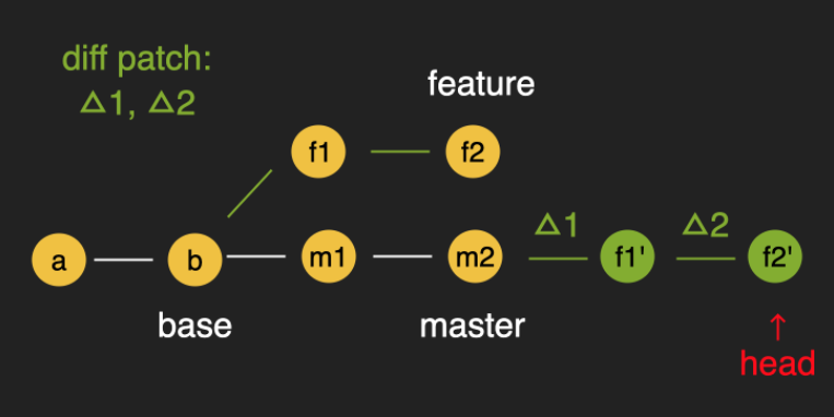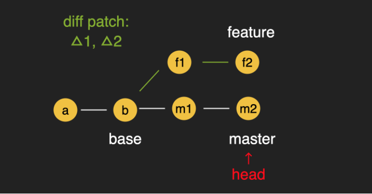 master와 feature의 공통 조상이 되는 base 커밋부터 현재 브랜치까지의 변경 사항(▵1, ▵2)을 구해서 patch로 저장해 둠
