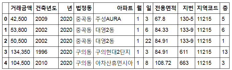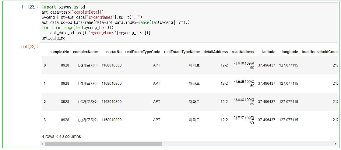 다른 정보들도 위의 플로우를 따라서 비슷하게 긁어서 apt_data_pd 변수에 저장된 dataframe에 join함수를 이용하여 합치면 된다.