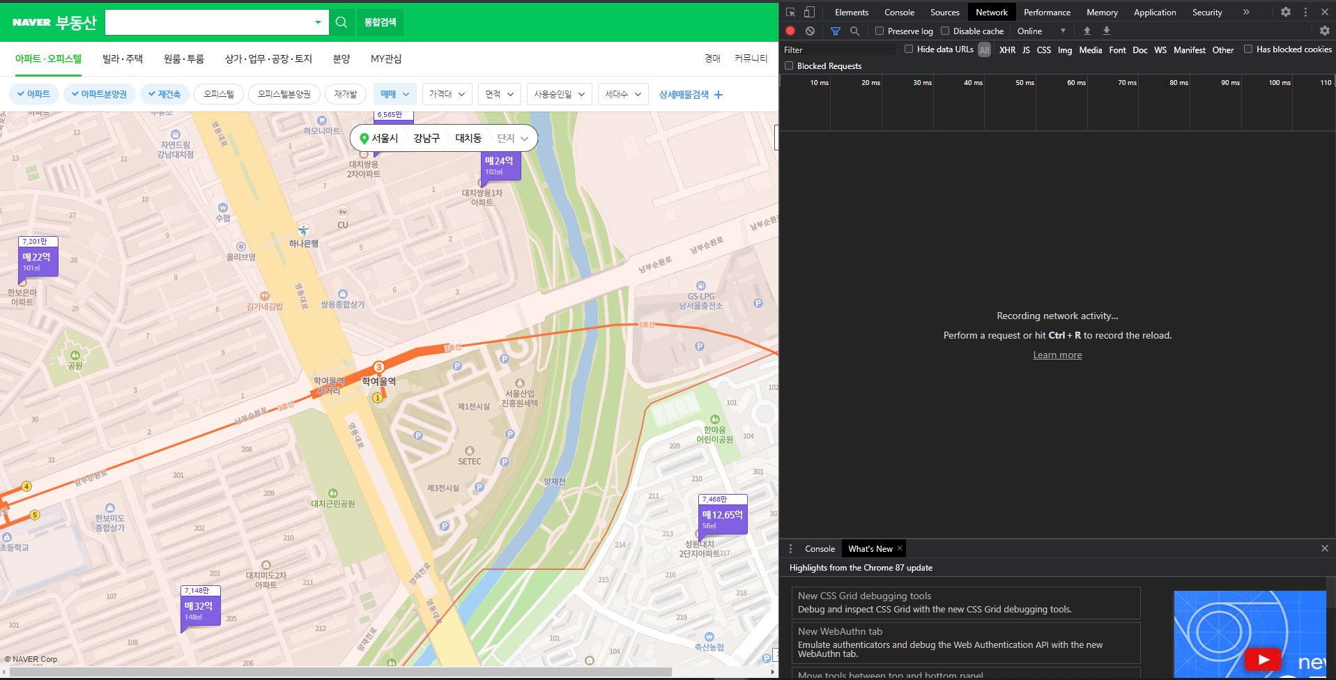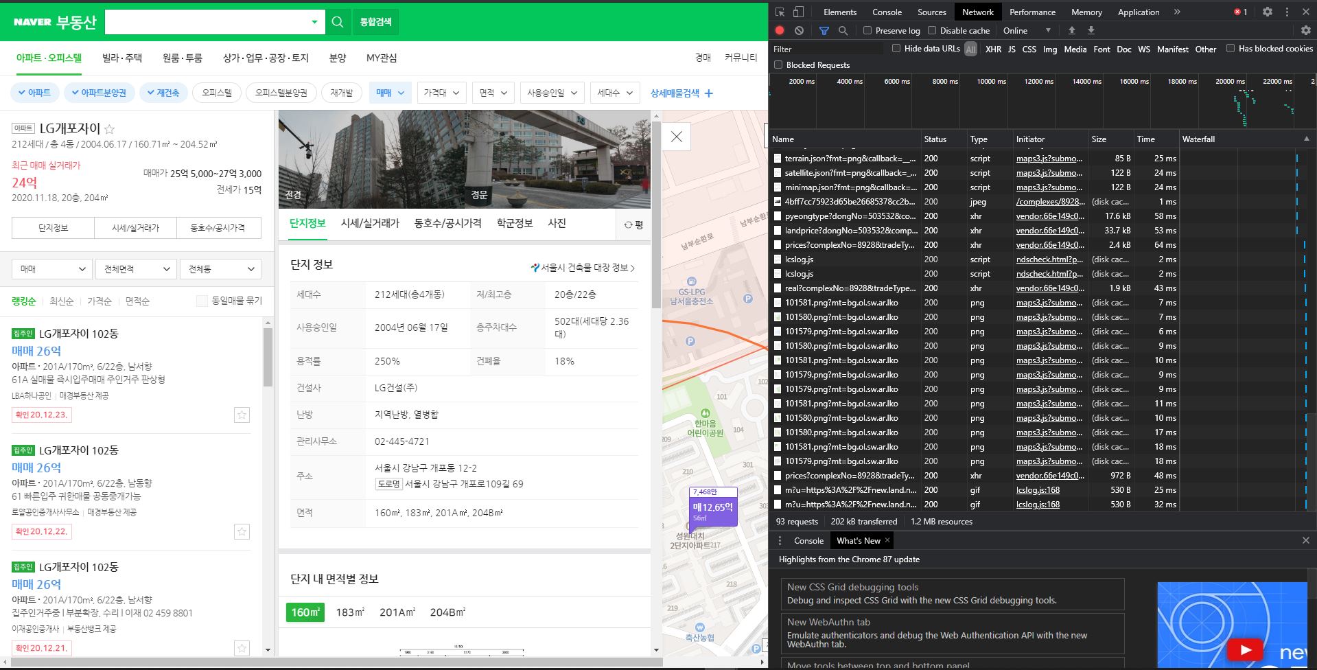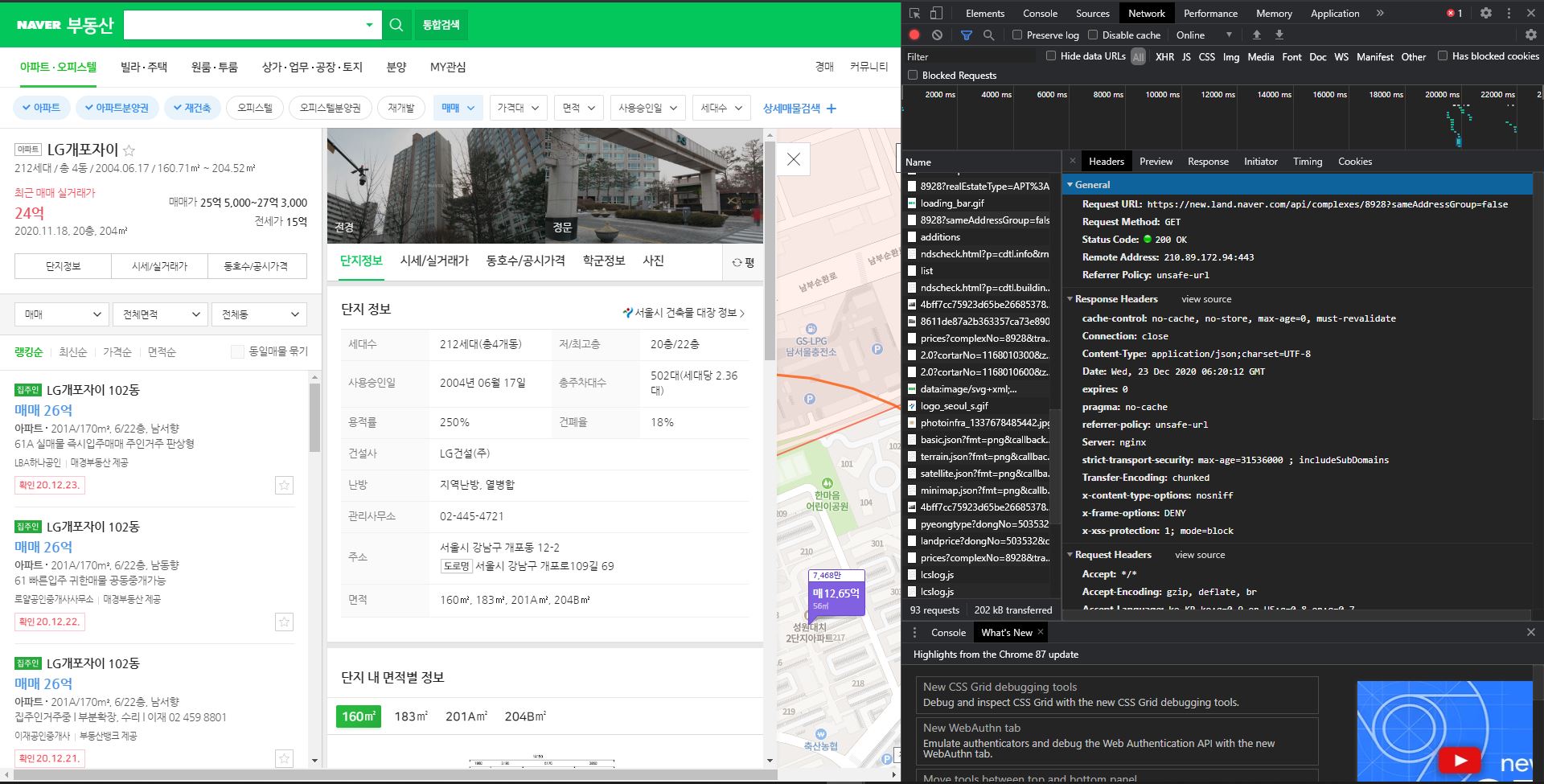 아까 개포동을 선택하여 LG개포자이를 선택하기전 F12버튼을 눌러주자(크롬기준) 그러면 알수 없는 정보들이 떠있는 요상한 화면이 뜰것이다.