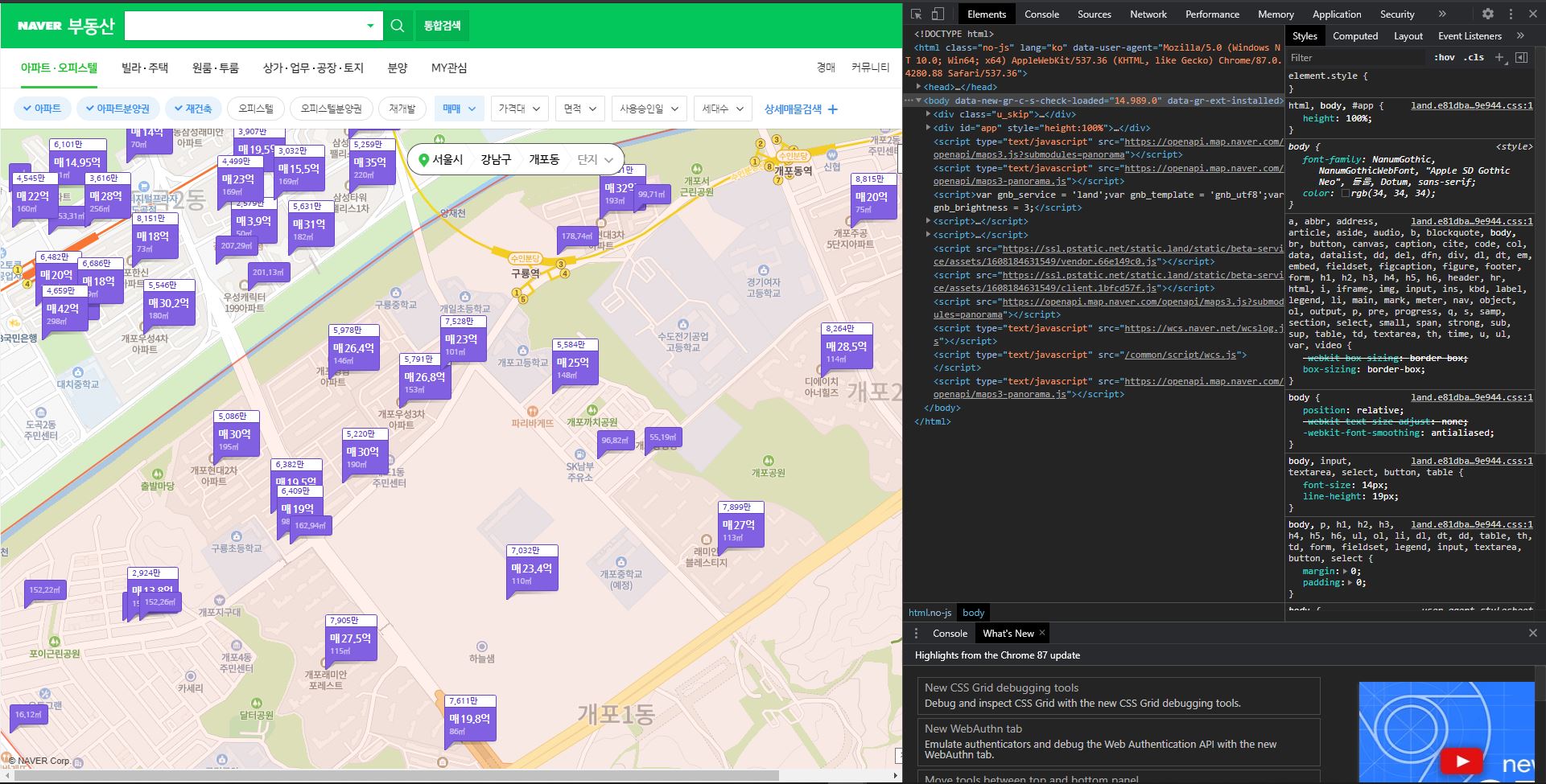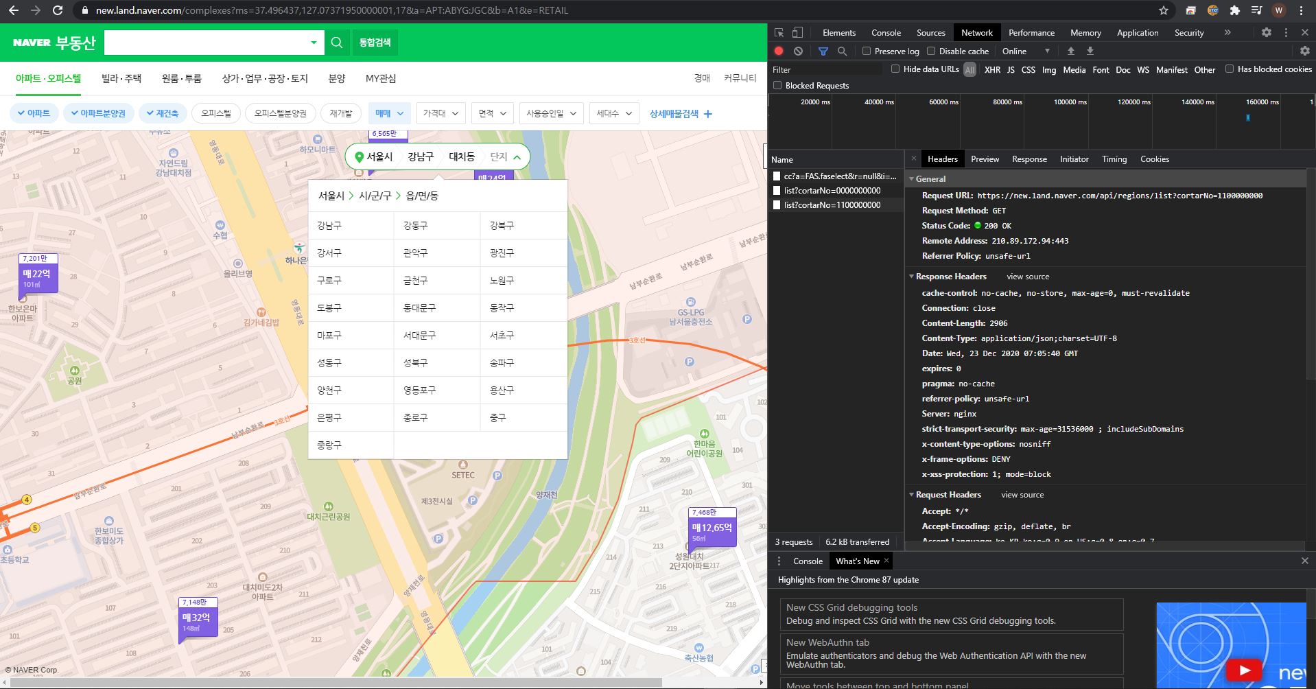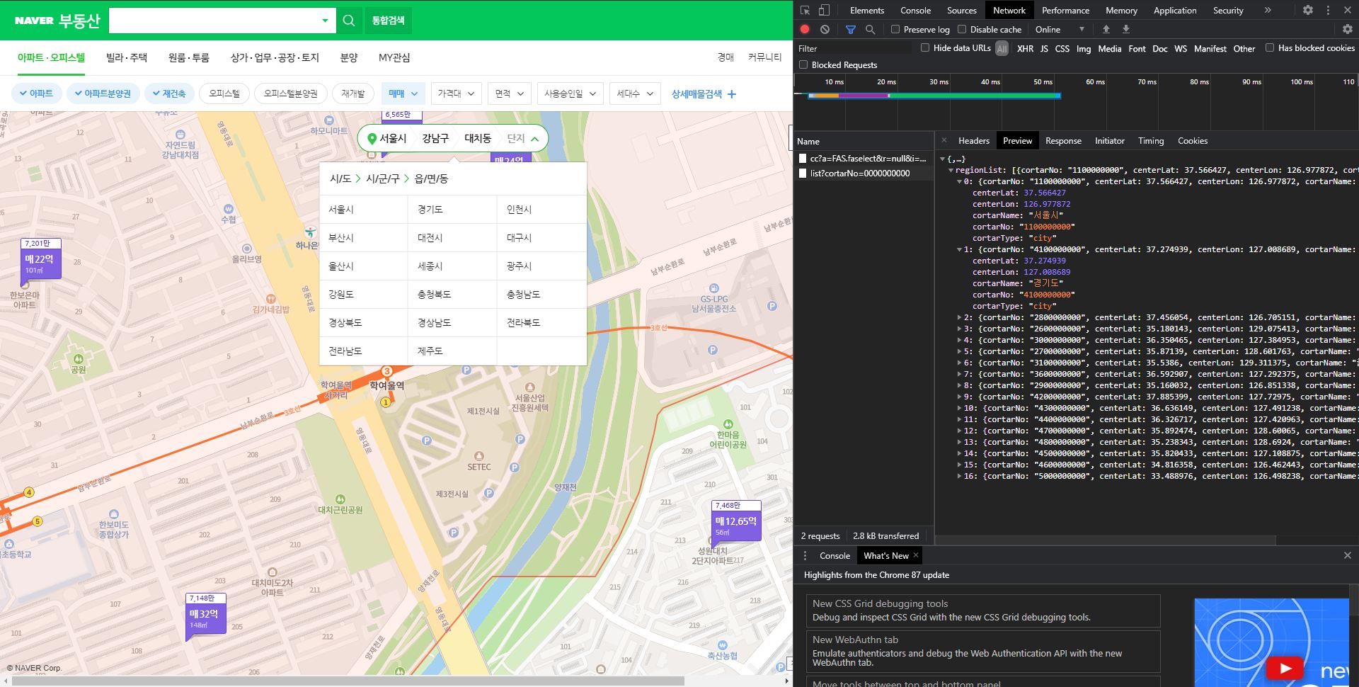 아까 개포동을 선택하여 LG개포자이를 선택하기전 F12버튼을 눌러주자(크롬기준) 그러면 알수 없는 정보들이 떠있는 요상한 화면이 뜰것이다.