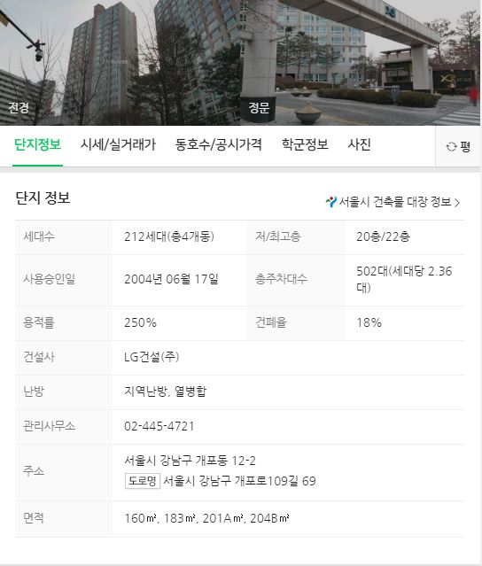 LG개포자이를 선택하면 단지정보, 시세/실거래가, 동호수/공시가격, 학군정보등의 정보들이 있다.
