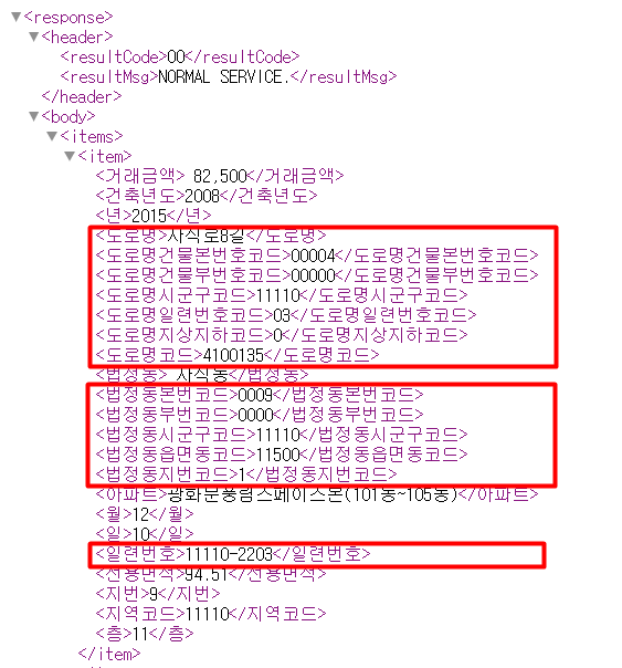 예를들어 LG개포자이를 선택하려면 서울시, 강남구, 개포동, LG개포자이의 고유 넘버를 다 알아야 정보를 얻을수 있는 것이다. 이를 코드로 표현하면 아래와 같다.