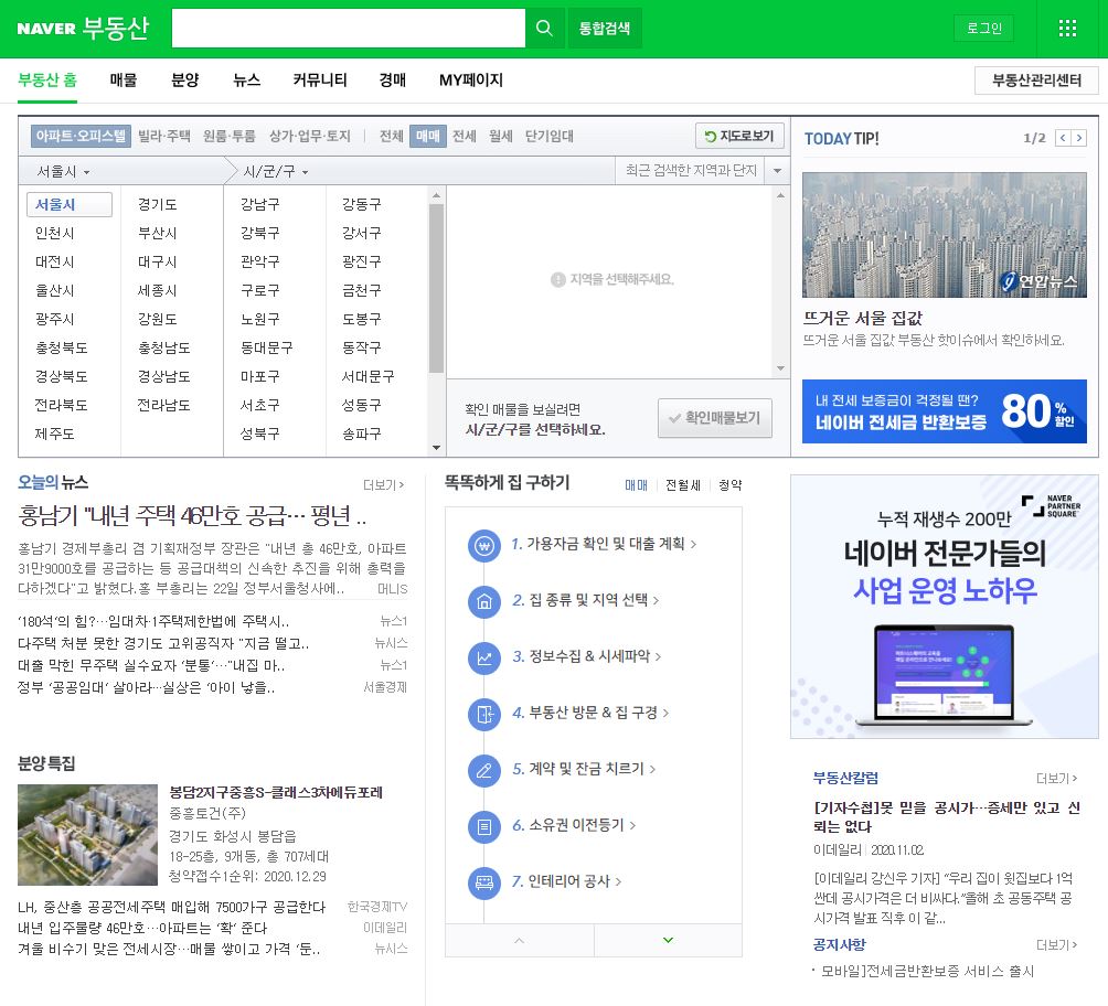 제일먼저 https://land.naver.com/ 를 들어가 홈화면을 보자