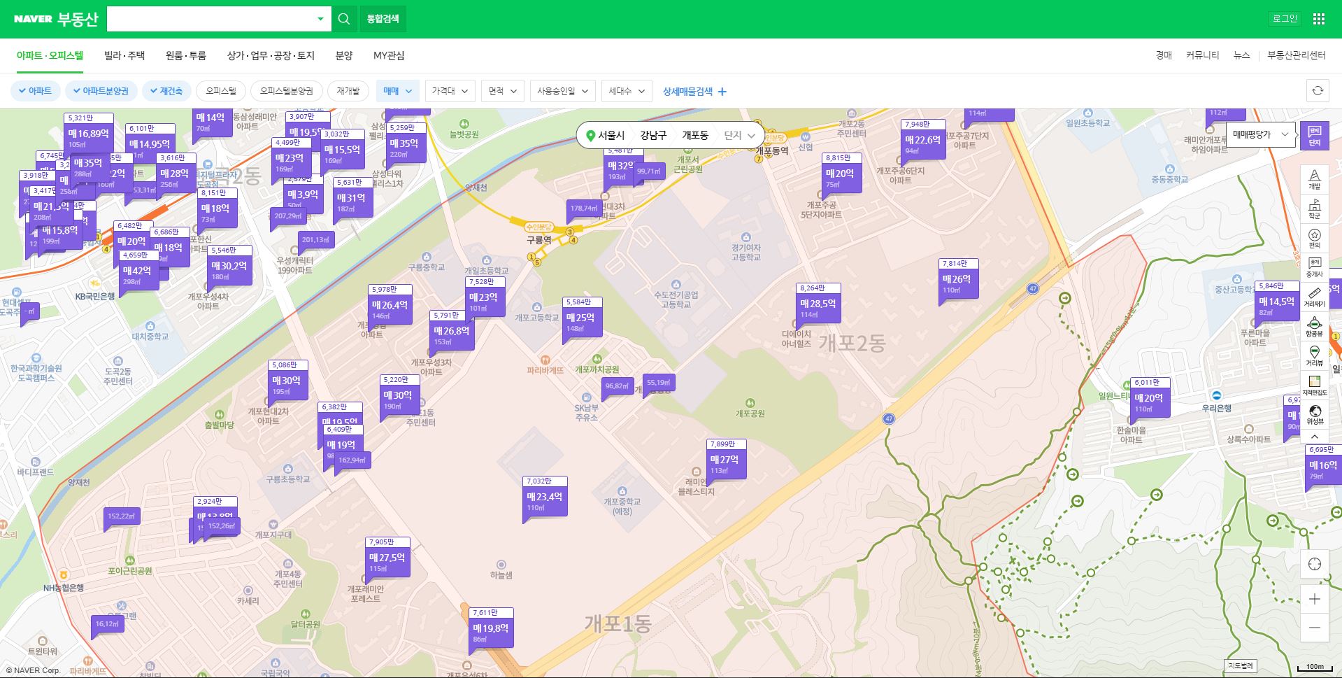 이창에서 서울시-> 강남구->개포동을 선택하고 “확인매물보기”를 누르면 아래와 같이 사진이 뜰것이다.
