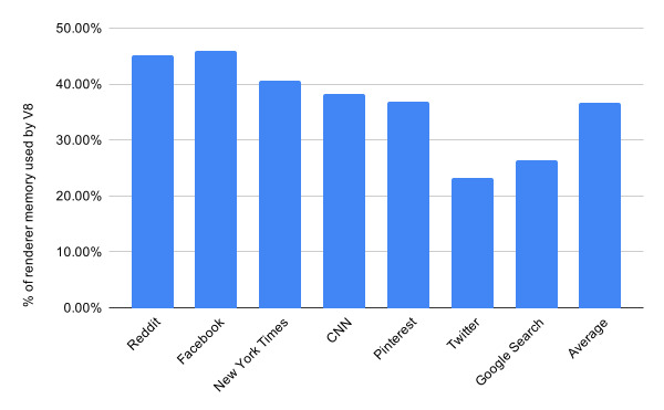 Before diving into the implementation, we need to know where we are standing to correctly assess the situation. To measure our memory and performance we use a set of web pages that reflect popular real-world websites. The data showed that V8 contributes up to 60% of Chrome’s renderer process memory consumption on desktop, with an average of 40%.