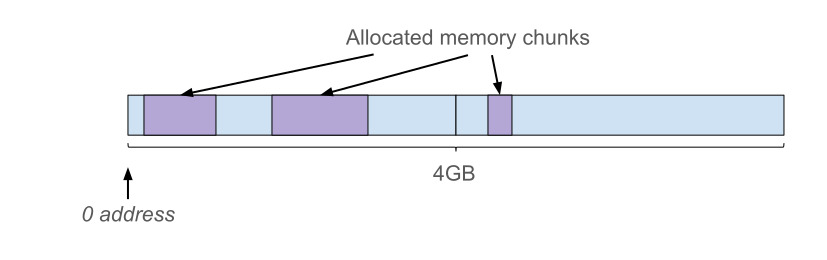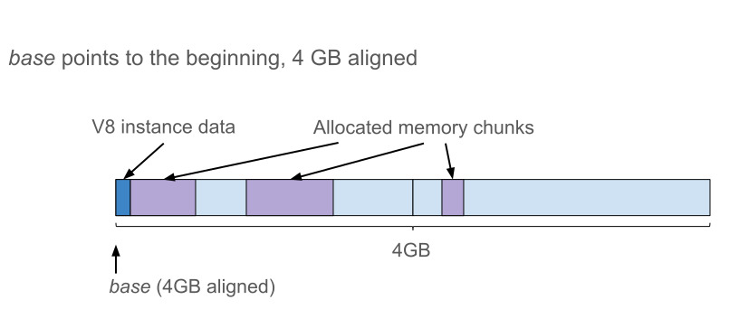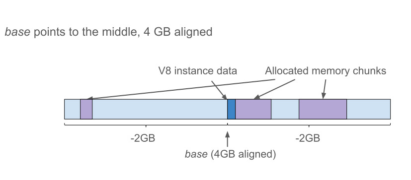 Unfortunately, this is not an option for V8 since Chrome’s renderer process may need to create multiple V8 instances in the same renderer process, for example for Web/Service Workers. Otherwise, with this scheme all these V8 instances compete for the same 4-GB address space and thus there is a 4-GB memory limit imposed on all V8 instances together.