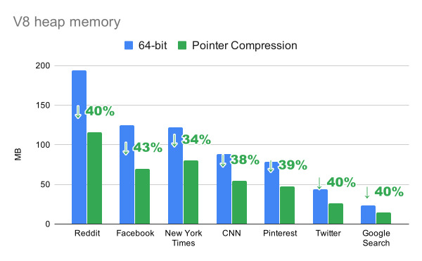 In them, we observed that Pointer Compression reduces V8 heap size up to 43%! In turn, it reduces Chrome’s renderer process memory up to 20% on Desktop.
