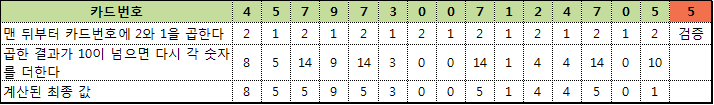 55에서 일자리 끝숫자는 5 이고, 10에서 5를 빼면 5가 된다. 카드번호 제일 끝자리 검증코드 5와 같으므로 유효한 카드번호이다.